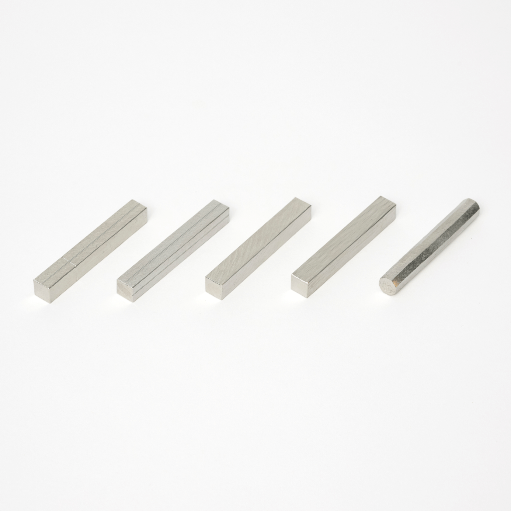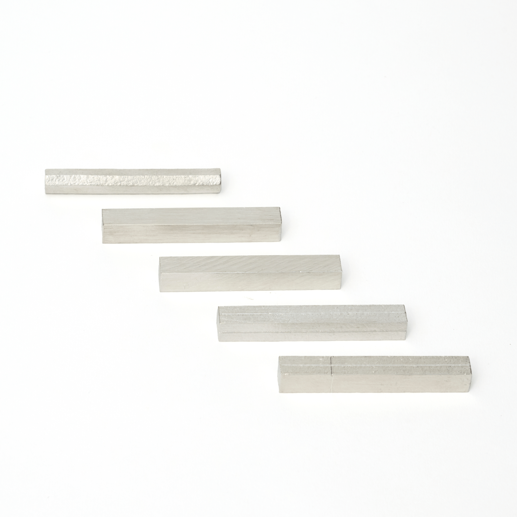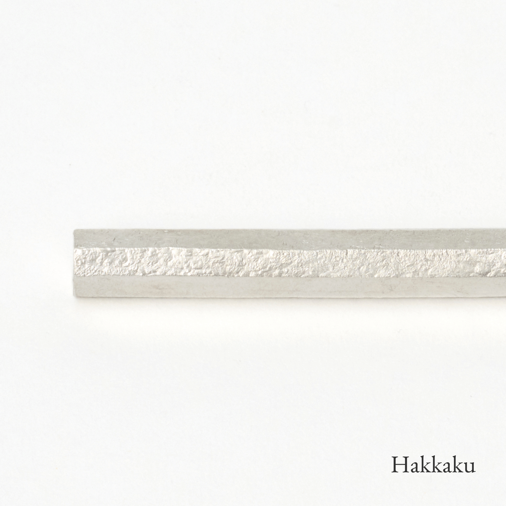 Des motifs simples sont gravés sur la surface de formes rectangulaires et octogonales à l’aide de divers marteaux. Ces empreintes martelées ne sont pas seulement destinées au design, mais leur texture permet également de masquer les rayures.