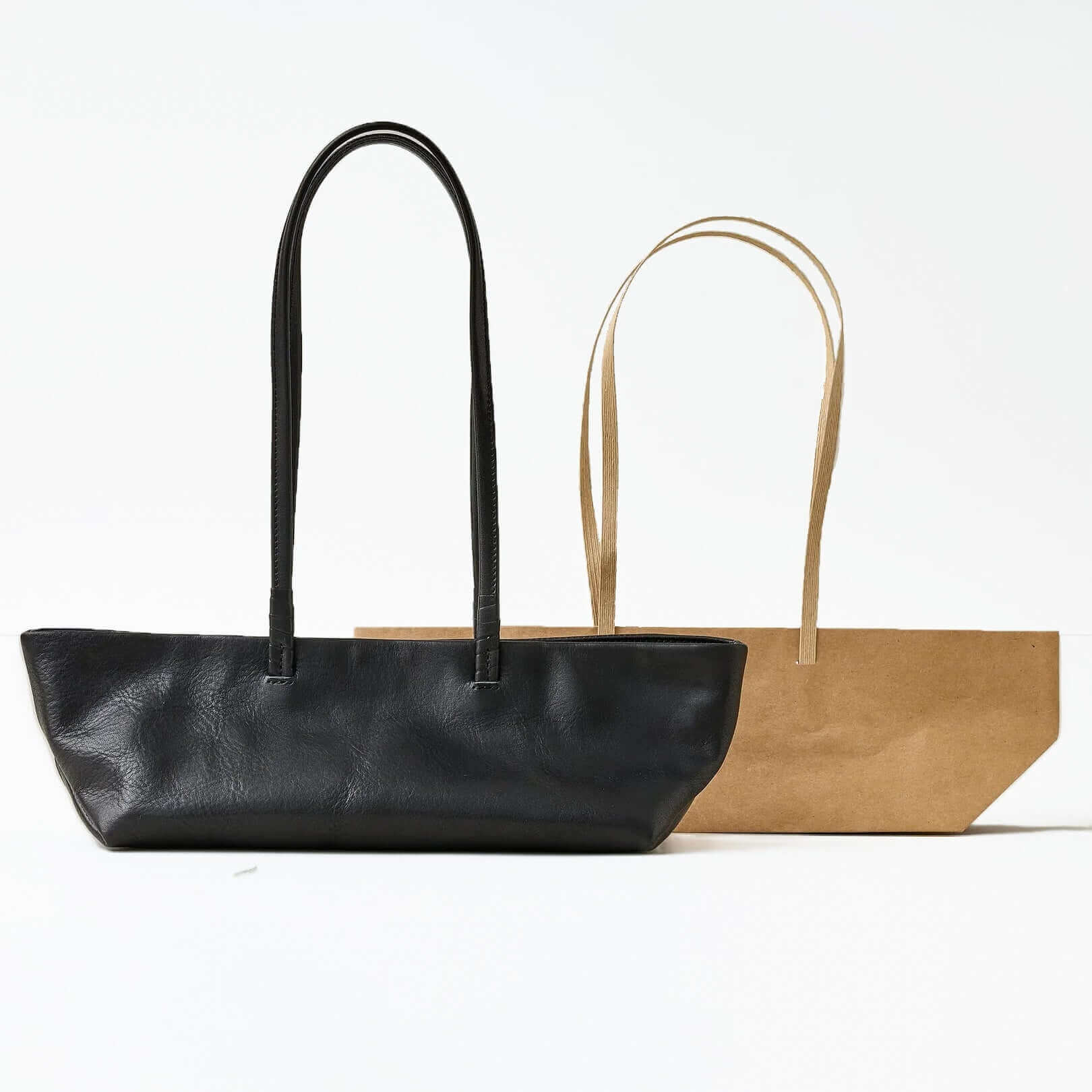 Veuillez noter : le Tote OGATA présenté avec le sac en papier est de taille S, mettant en valeur la silhouette en forme de bateau conçue pour les boutiques OGATA.