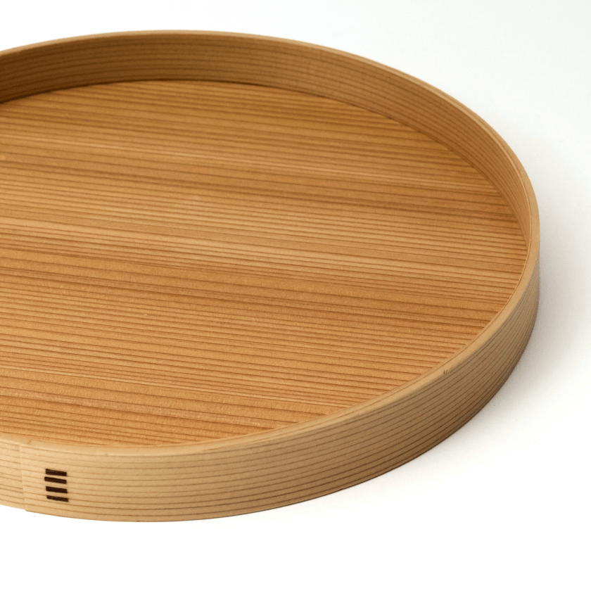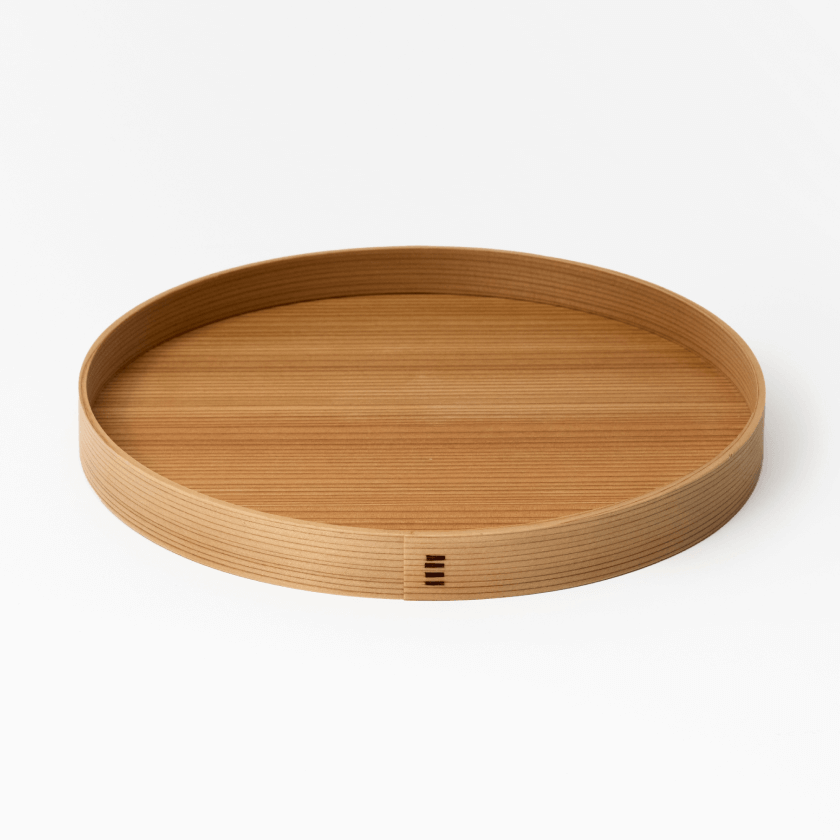 Un plateau circulaire en bois. Fabriqué à la main par des artisans de HIROSAKI, dans la préfecture d'AOMORI au Japon, à partir de cèdre AKITA.