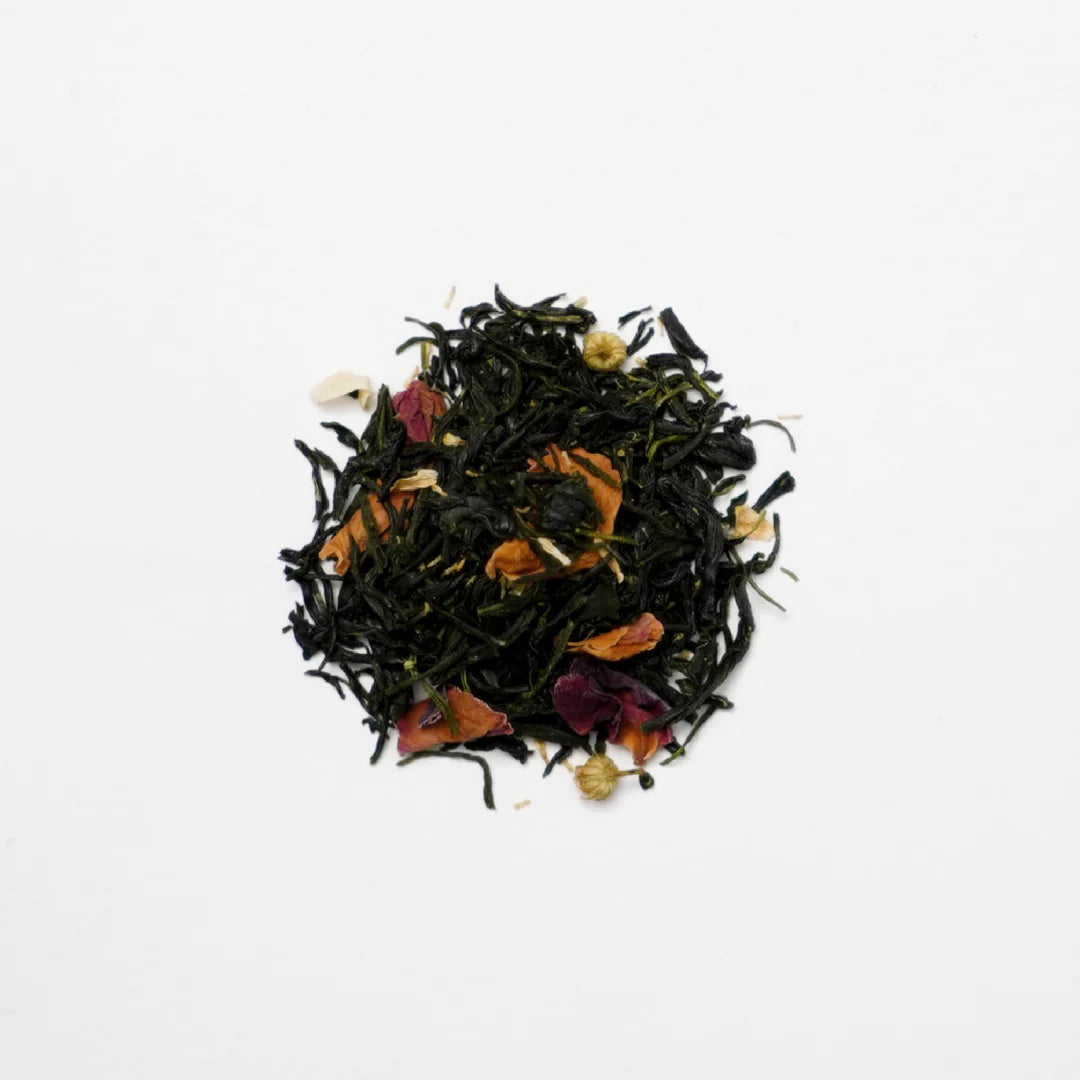 希少な玉緑茶の玉露に、華やかな風味のローズレッドと甘い香りのカモミールを合わせたブレンドです。玉露ならではの旨味とともに、香ばしさや薔薇の花束のような華やかな香りをお愉しみいただけます。