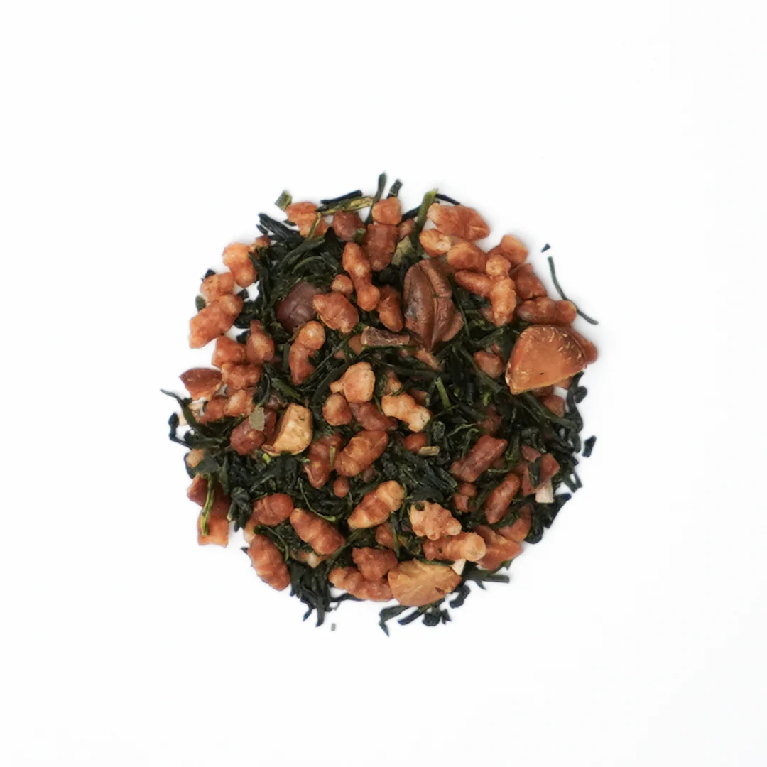 豆のような旨味をもつ蒸製玉緑茶に煎った玄米や大豆、大麦と柿の葉を合わせました。芳ばしさとさわやかな渋味、後味のよさは食事とも好相性。秋の味覚とともにお愉しみいただきたいブレンドです。